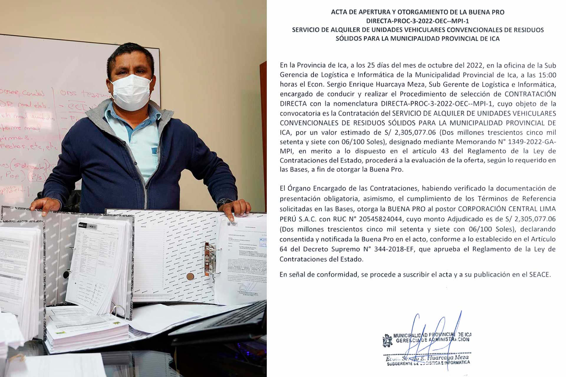 Denunció que el martes 25, el subgerente de logística e informática de la comuna Sergio Huarcaya Meza, entregó la buena pro de contratación directa, a esta misma corporación, por 2 millones 305 mil 77 soles por 137 días de alquiler y el recojo de 143 toneladas de basura que diariamente se generan en la ciudad.